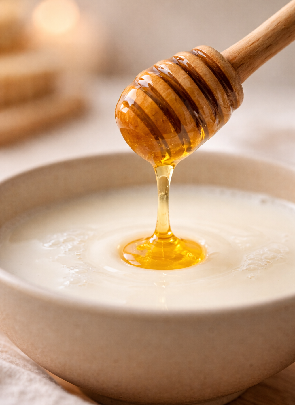 - Em um recipiente, misture 2 colheres de mel com um pouco de leite morno até dissolver.